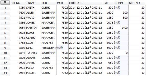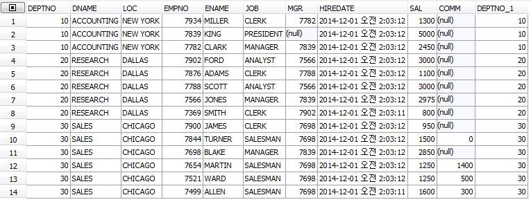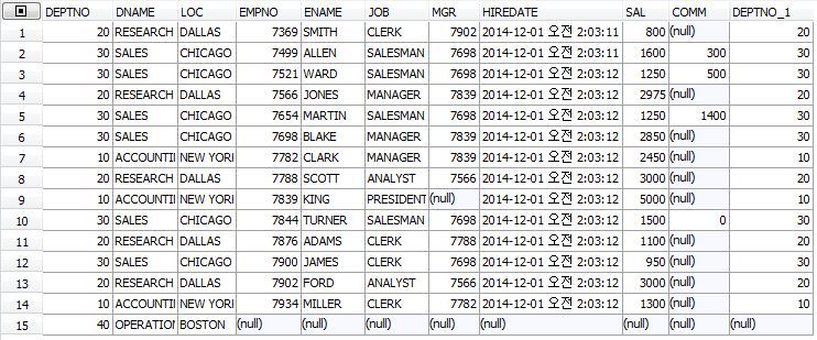 LEFT OUTER JOIN은 오른쪽 테이블(아래 예제에서 emp테이블)에 조인시킬 컬럼의 값이 없는 경우 사용한다.