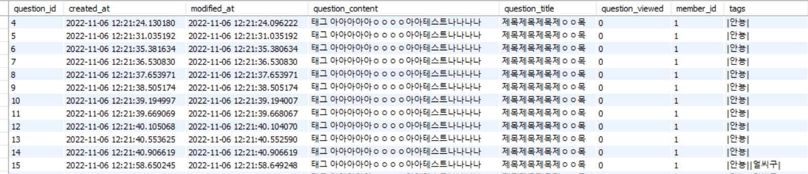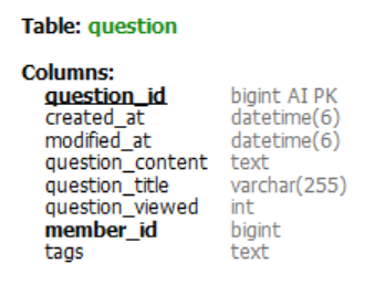 MySQL DB에 Question 테이블 정의 내용